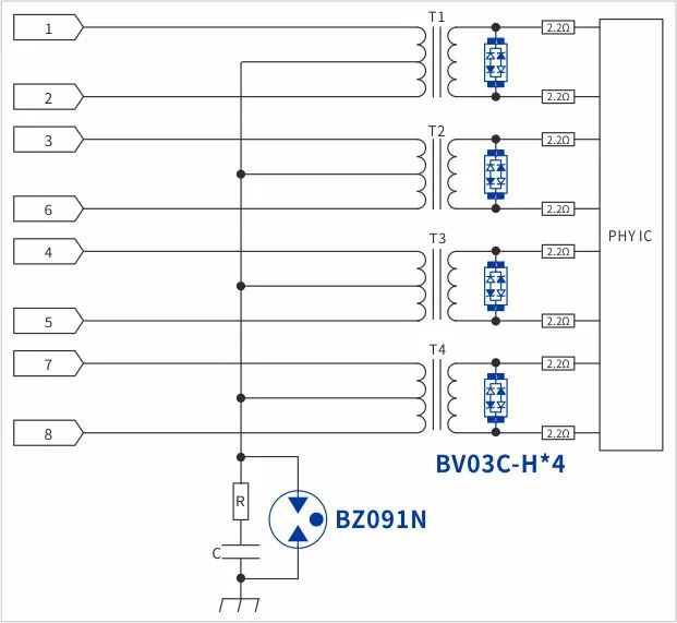 網(wǎng)口防護電路大致如(圖1),客戶初級側(cè)共模浪涌采用90V的GDT——BZ091N,次級采用低容BV03C-H做差模防護,抑制浪涌或ESD電壓尖峰。 客戶反饋共模浪涌10/700us 6kV測試可以通過,端口ESD空氣15KV測試設(shè)備死機需重啟。通過溝通得知,板子面積較小空間受限,CPU與phy都靠近RJ45端口,布局大致如(圖2)。